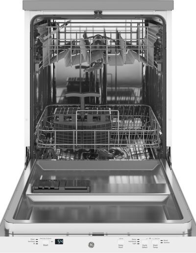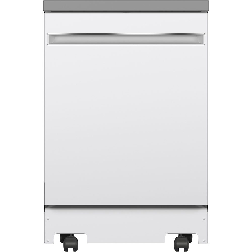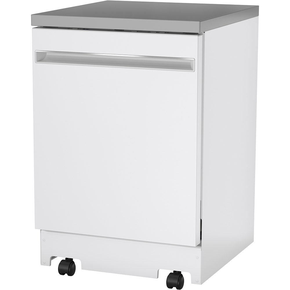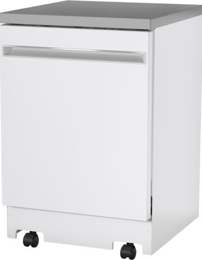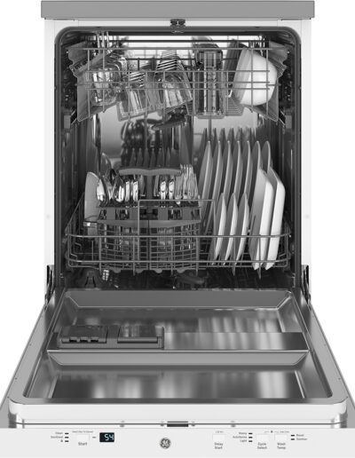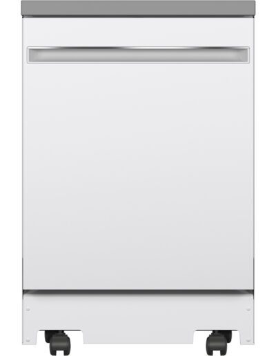 Colour: White | Control Location: Top | Control Type: Fully Integrated Electronic | Delay Start: 1-12 hr. | Dishwasher Cycles: Light Wash | Dishwasher Drying Features: Condensate Dry | Dishwasher Options: Child Lock | Dishwasher Options: Last Cycle Memory | Dishwasher Options: Rinse Aid with Indicator and Adjustment | Dishwasher Options: Sanitize (NSF) | Dishwasher Options: Temp Boost | End-of-Cycle Signal: Yes | Energy Star: Yes | Hard Food Disposer: Yes | Indicator Lights: 1 “Sanitized” Light | Leveling Legs (4): 4 | Noise Levels: 54 dBA | Number of Cycles: 3 | Number of Place Settings: 12 Place Settings | Rack Features: Upper Rack – Adjustable | Rack Features: Utility Shelf | Rack Material: Nylon | Sensor: Clean Sensor | Style: Portable | Tub and Door Liner: Stainless Steel | Volts / Hertz: 120 v / 60 Hz | Warranty: 1 Year Parts & Labour; In Home | Wash Arm – Lower Level: Yes | Wash Arm – Mid-Level: Yes | Wash Arm – Upper Level: Nozzle | Wash System: Standard | Water Filtration: Yes | Width: 24″