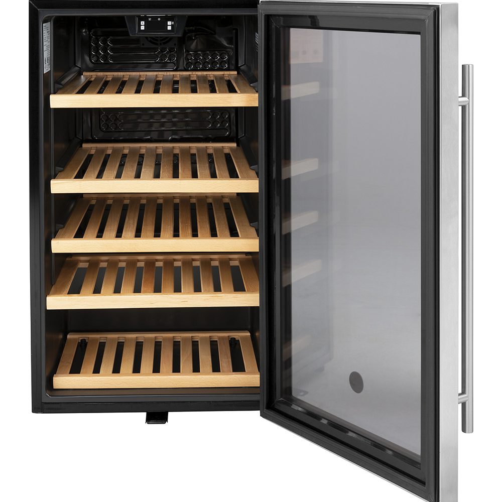 Capacity: 4.1 cu. ft. | Colour: Glass + Stainless Steel | Control Type: Electronic | Installation Options: Built-In or Free-Standing | Interior Lights: Yes | Number of Bottles: 125 cans + 31 Wine Bottles | Shelf Fronts: Genuine Oak | Temperature Display: Yes | Volts / Hertz: 120 v / 60 Hz | Warranty: 1 Year Limited Parts & Labour | Wine Racks: Yes