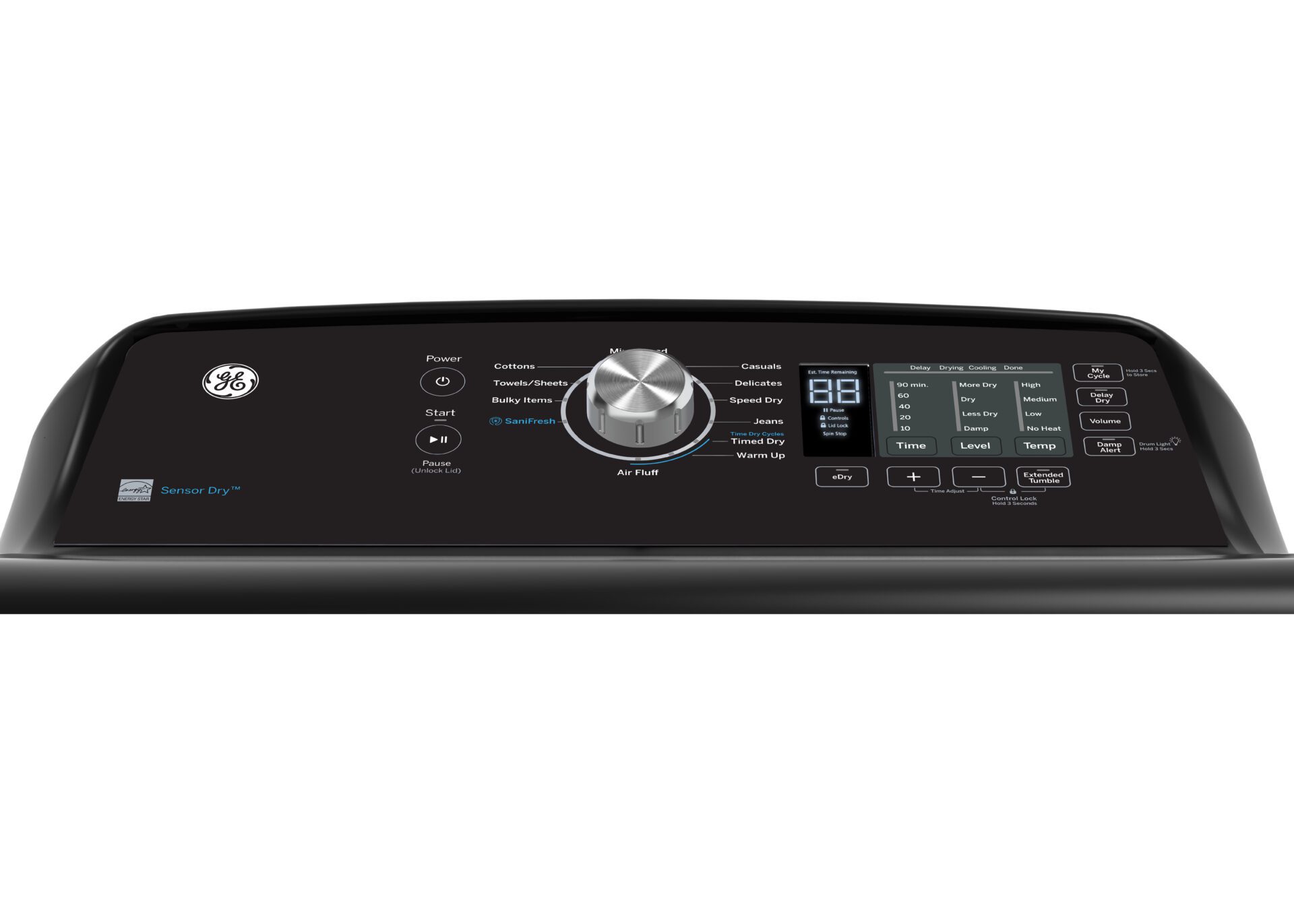 Adjustable End-of-Cycle Signal: Yes | Capacity: 7.4 cu. ft. | Colour: Diamond Grey | Control Type: Electronic | Damp Alert: Yes | Drum: Aluminized Steel | Dryer Cycles: Cottons | Dryer Cycles: Casuals | Dryer Cycles: Delicates | Dryer Cycles: Timed Dry | Dryer Cycles: Mixed Load | Dryer Cycles: Speed Dry | Dryer Cycles: Jeans | Dryer Cycles: Warm Up | Dryer Cycles: Air Fluff / Quick Fluff | Dryer Cycles: Sanitize | Dryer Cycles: Bulky Items | Dryer Cycles: Towels & Sheets | Dryer Options/Settings: Delay Start | Dryer Options/Settings: My Settings | Dryer Options/Settings: SaniFresh | Energy Saving Option: eDry | Energy Star: Yes | Fuel Type: Electric | Heat Selections: 4 | Interior Light: Yes | LED Display: Yes | Matching Washer: GTW680BMRDG | Number of Dryer Cycles: 12 | Sensor Dry: Yes | Wrinkle Care: Yes