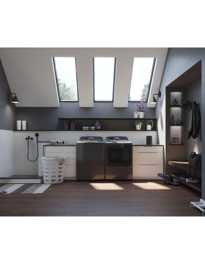 Adjustable End-of-Cycle Signal: Yes | Blocked Vent Sensor: Yes | Capacity: 7.4 cu. ft. | Colour: Diamond Grey | Control Type: Electronic | Control Type: Capacitive Touch Controls | Depth with Door Open 90° (in.): 53 | Door Type: Glass | Drum: Aluminized Alloy | Dry Levels: 5 | Dryer Cycles: Bulky Items | Dryer Cycles: Steam | Dryer Cycles: Delicates | Dryer Cycles: Downloaded (Casuals Default) | Dryer Cycles: Jeans | Dryer Cycles: Mixed Load | Dryer Cycles: Colours/Normal | Dryer Cycles: Quick Dry | Dryer Cycles: Sanitize | Dryer Cycles: Timed Dry | Dryer Cycles: Towels & Sheets | Dryer Options/Settings: Wrinkle Care | Dryer Options/Settings: Time/Temp/Dry Level | Dryer Options/Settings: eDry | Dryer Options/Settings: Washer Link (App Only) | Dryer Options/Settings: My Cycle | Dryer Options/Settings: Reduce Static | Dryer Options/Settings: Tangle Control | Dryer Options/Settings: Light/Sound | Dual Thermistors: Yes | Energy Star: Yes | Exhaust Options: 4-Way (Rear; Right; Left & Bottom) | Fuel Type: Electric | Heat Selections: 5 | Interior Light: Yes | LED Cycle Countdown: Yes | LED Status Indicator Lights: Yes | Lint Filter with Reminder: Yes | Matching Washer: PTW700BPTDG | Moisture Sensor: Sensor Dry | Number of Dryer Cycles: 11 | Reversible Door: Yes | Steam: Yes | Style: Top Load Matching | Temperature Options: 5 Selections – No Heat to Hot | Timed Dry: 90mins | Timed Dry: Warm Up (App only) | Volts / Watts / Amps: 208V/4400W/22A,60Hz or 240V/5600W/24A, 60Hz | Warranty: 1 Year Limited Parts & Labour | Width: 27″ | WiFi Connect: Built-in